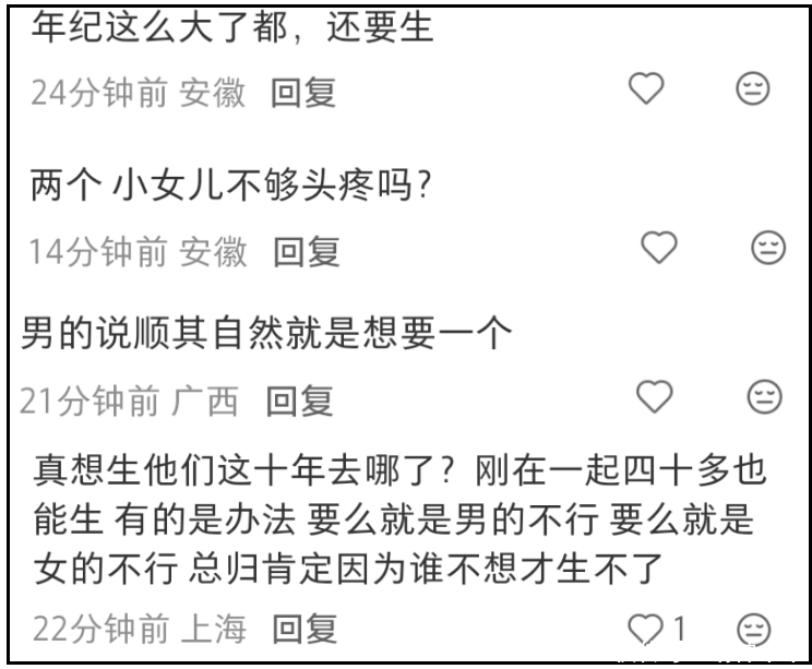 正如张泉灵和网友所说,一个男的对自己55岁的妻子强调我们顺其自然生四胎,基本上约等于催生——55岁了,生了三个女儿了,还要生啊?